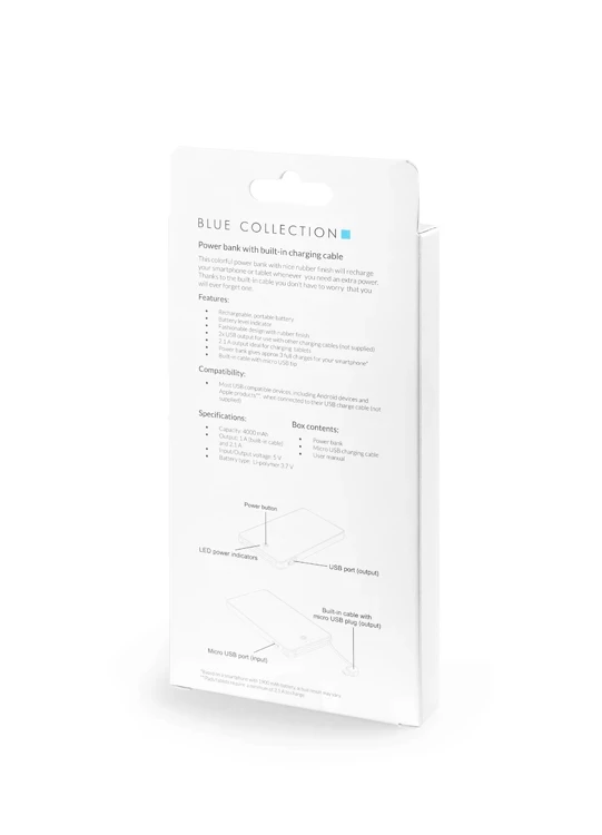 De VIVID 4000 mAh powerbank is een moderne promotionele gadget die functionaliteit combineert met esthetiek en een praktisch geschenk is voor klanten en zakenpartners. Dankzij het slanke ontwerp en het rubberen oppervlak is het apparaat niet alleen handig, maar voelt het ook prettig aan. Dankzij de geïntegreerde micro-USB-kabel en de extra USB-poort kunnen twee apparaten tegelijk worden opgeladen, wat de bruikbaarheid in het dagelijks gebruik vergroot. Bovendien maakt de mogelijkheid van full-colour UV-bedrukking op het oppervlak van de powerbank effectieve merkpromotie mogelijk.